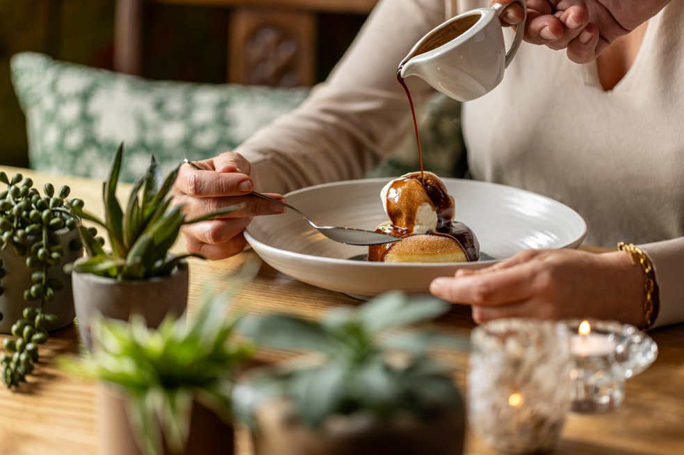 Proper sticky toffee pudding, your choice of custard or ice cream (v) 634 kcals
